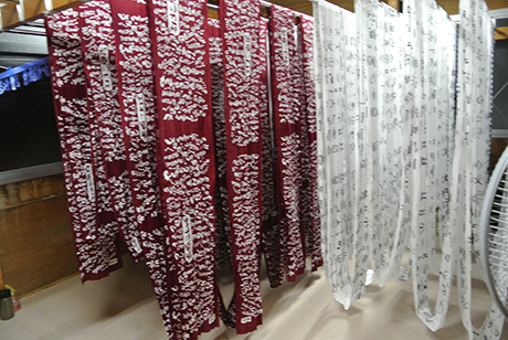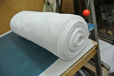 形紙の長さは90~100㎝ほどで、糊をつけた反物を形紙の長さに折り重ね、再度糊付けを行い、一反の反物を糊付けしながら蛇腹状に折りたたみます。