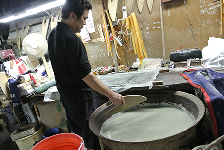 反物の上に形紙を置き、防染糊をつけて糊付を行います。