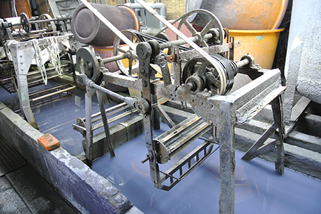 染料を十分に注いで染め上った反物は水洗い場に運ばれます。